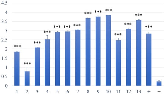 Assessment of biofilm formation in S. aureus isolated from skin lesions. Samples 1–13—strains with weak or strong production of biofilm; positive (+) control—biofilm-forming S. aureus CCM 4223; negative (−) control—non-biofilm-forming S. epidermidis CCM 4418. *** Significantly higher ability to produce biofilm (p < 0.001).