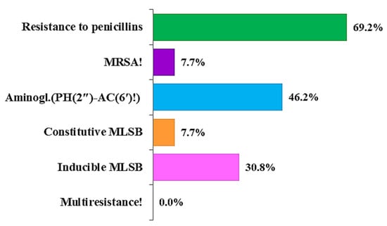 According to the resistance profile, the system automatically evaluated the resistance mechanisms (Figure 2). It is important to note that multiple resistance mechanisms have been identified in some strains simultaneously. The most common mechanism was resistance to penicillins (69.2%), followed by resistance to aminoglycosides (PH(2″)-AC(6′)!) (46.2%); this represents complications in treatment with these antimicrobial agents and combined enzymatic resistance to gentamicin, tobramycin, netilmicin, and ampicillin. The MLSB (macrolide-lincosamide-streptogramin B) mechanism was also present. The MLSB inducible (MLSB/i) (30.8%), manifested in clinical resistance to lincosamides and streptogramin B induced by 14- and 15-membered macrolides, constitutive (MLSB/c) (7.7%), determining resistance to all MLSB antimicrobials, were found [32]. One isolate (no. 11; 7.7%) was confirmed to have an MRSA mechanism, in which all beta-lactams are clinically ineffective in therapy. Multiresistance was not detected in any of the S. aureus isolates studied.