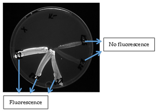 Evaluation of the fluorescence of S. aureus isolates detected under UV light after adding ethidium bromide to the medium.