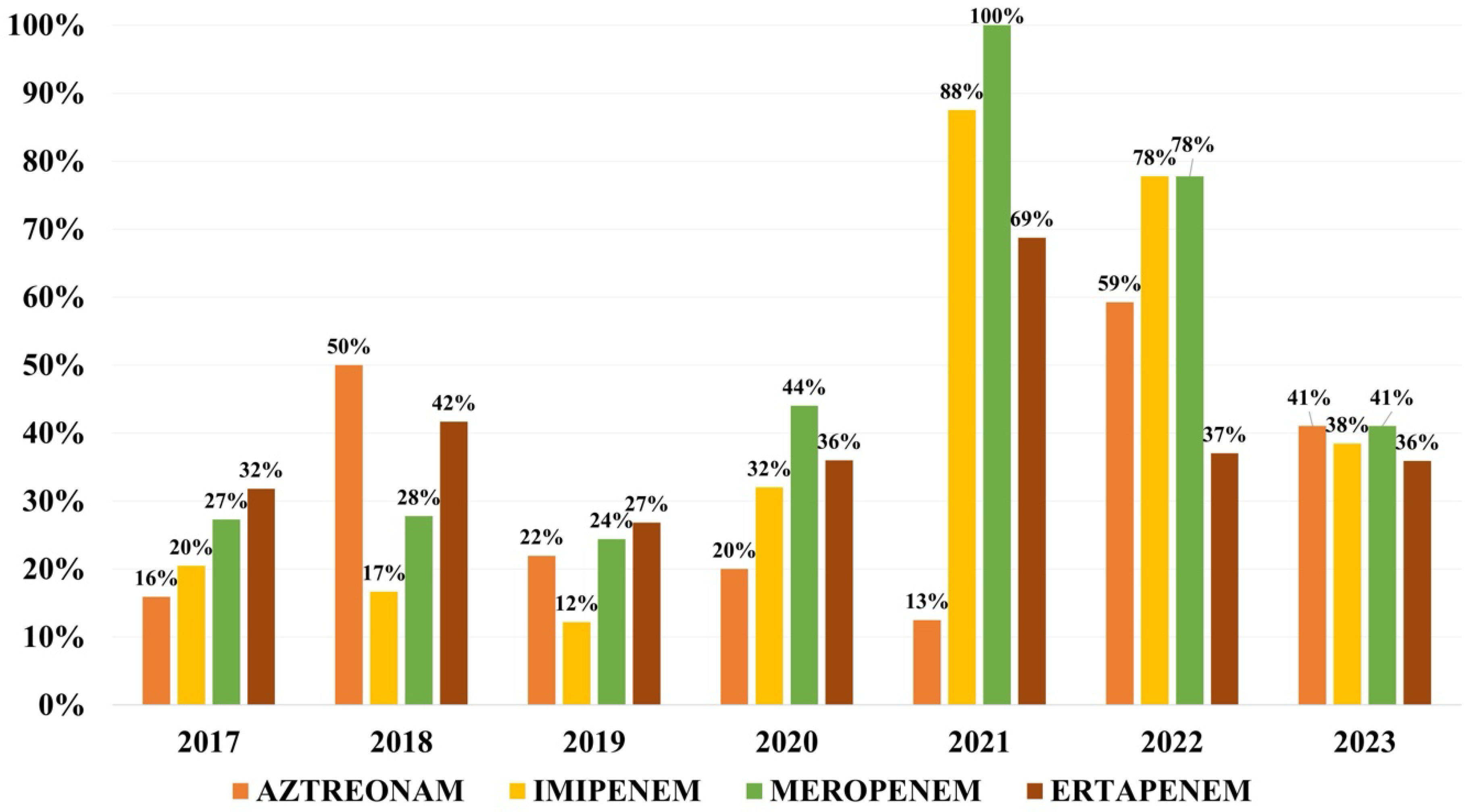 Borcan, A.M.; Rotaru, E.; Radu, G.; Costea, E.L.; Borcan, C.A.; Olariu, M.-C.; Simoiu, M. Resistance Trends in Klebsiella pneumoniae Strains Isolated from Bloodstream Infections in a Tertiary Care Hospital over a Period of 7 Years. Microorganisms 2025, 13, 2451. https://doi.org/10.3390/microorganisms13112451