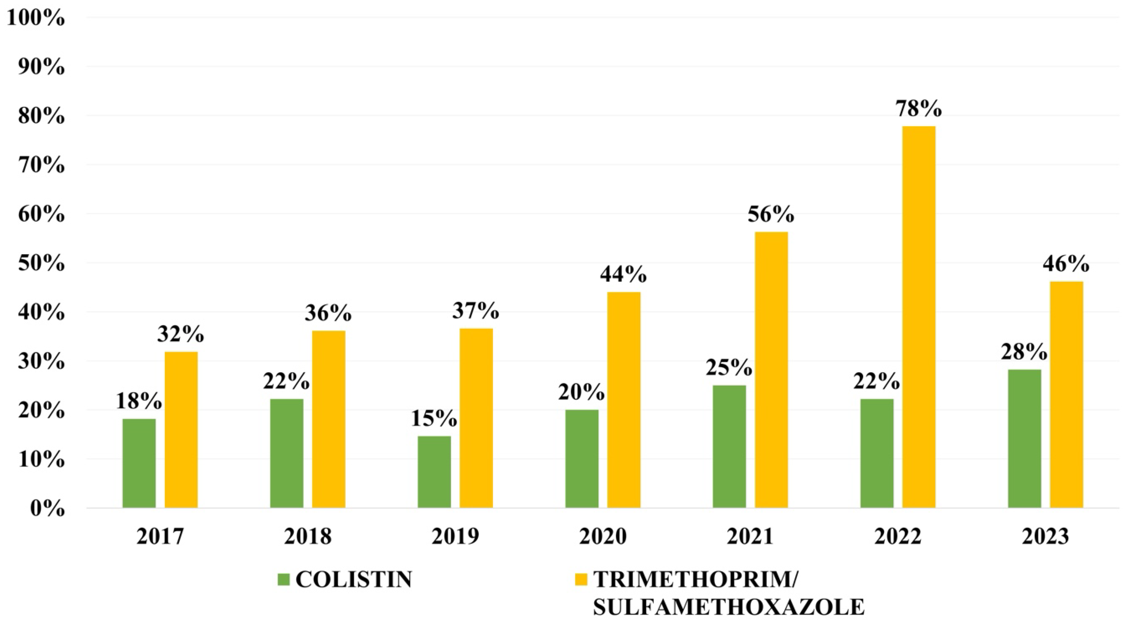 - European Centre for Disease Prevention and Control; World Health Organization. Antimicrobial Resistance Surveillance in Europe 2023–2021 Data; European Centre for Disease Prevention and Control: Stockholm, Sweden; World Health Organization: Geneva, Switzerland, 2023. [Google Scholar]