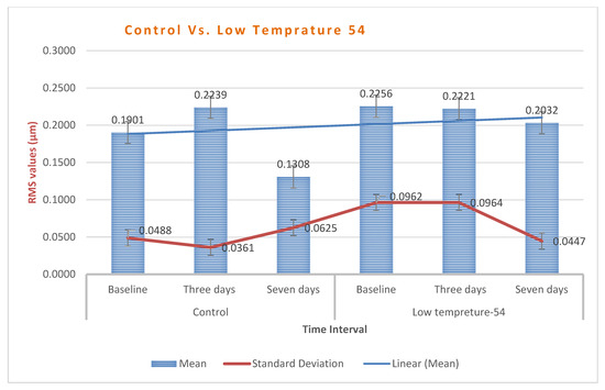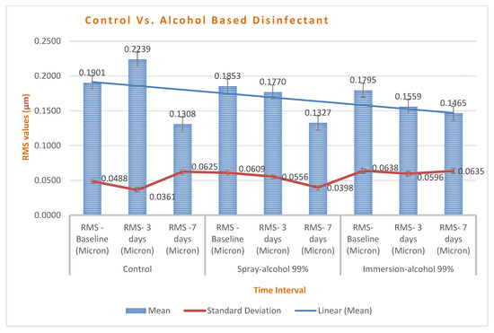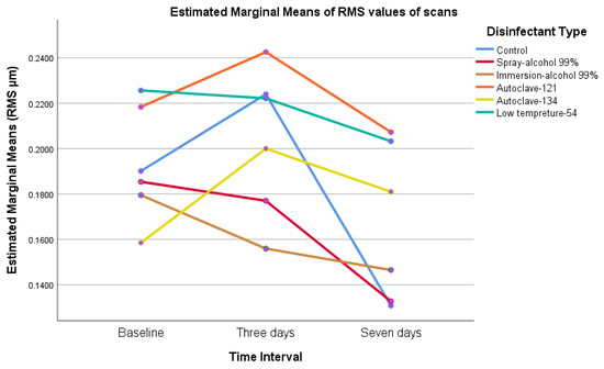 Regarding the comparison of disinfectant types, Tukey’s post hoc analysis revealed that RMS changes in the control group were not statistically significant compared to those in all other groups. However, the autoclave 121 °C and low-temperature 54 °C (p = 0.002 and 0.001) disinfectant groups showed significantly lower RMS values than both the spray alcohol and immersion alcohol 99% groups (p = 0.009 and 0.003, respectively), with values nearly comparable to those of the control group at 7 days (Table 6 and Table 7) (Chart 3, Chart 4, Chart 5 and Chart 6).