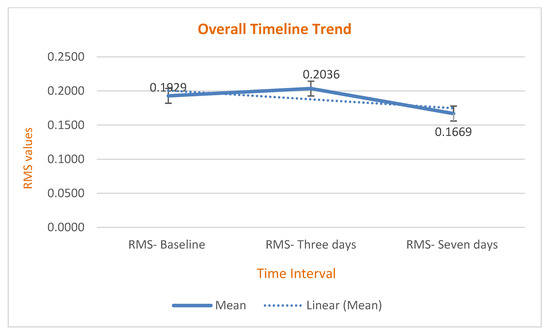 The marginal mean of root mean squared (RMS) values of all groups; we noticed that RMS changes start immediately after printing, then decline by day 7.
