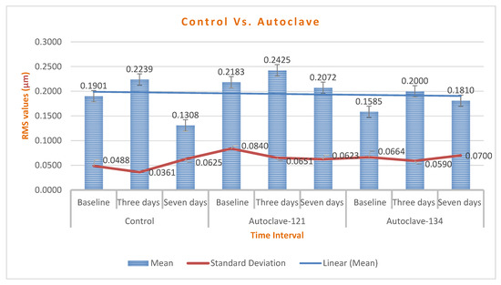 A comparison of RMS changes between control, autoclave 121 °C, and 134 °C groups; the mean of RMS changes was below 1000–2000 µm, which is insignificant.
