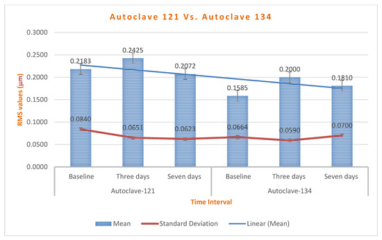 Autoclave 121 °C group revealed superior stability with RMS changes decreasing over time.