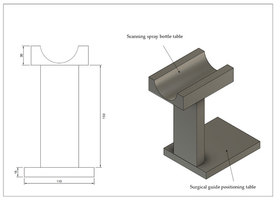 Spraying tool designed and 3D printed, with standard scanning spray distance at 15 cm; scanning spray bottle can be placed in its designated area so that the tip faces downward, directly toward the surgical guide.