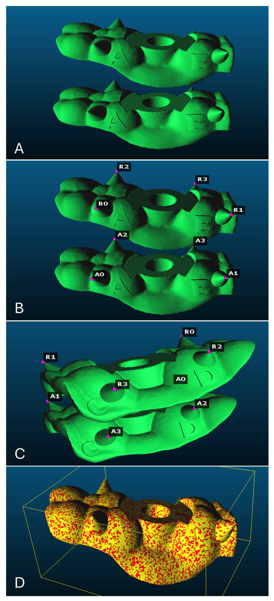 Each mesh contained 4 fixed, pyramid-shaped reference points (A,B) with four letters to standardize reference points determination sequence; (C) the 4 reference points selected on both meshes; (D) the two superimposed meshes.