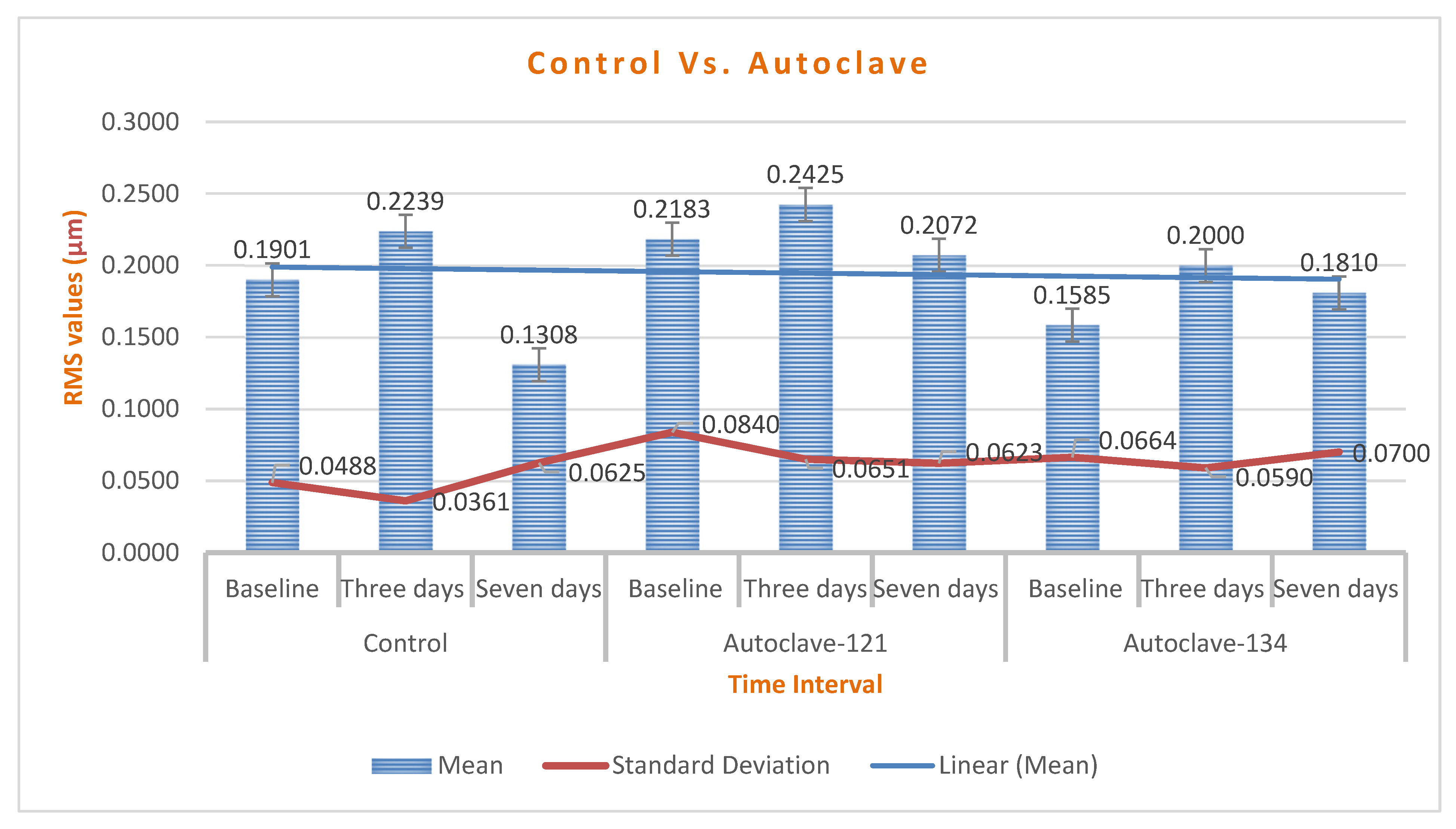 Further comparison between the two autoclave groups revealed that the autoclave 121 °C group exhibited significantly lower RMS changes than the autoclave 134 °C group (