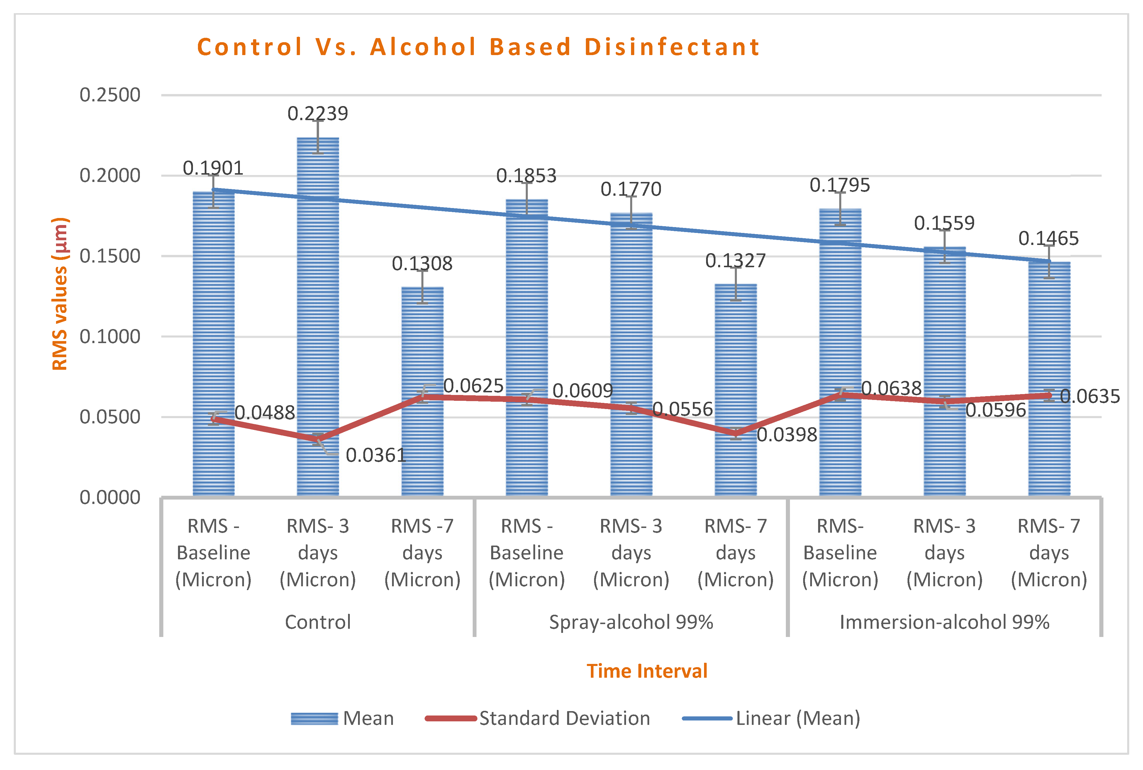 Our findings showed that RMS changes in the control group were not statistically significant compared to all other groups. However, the autoclave 121 °C and low-temperature 54 °C disinfectant groups (