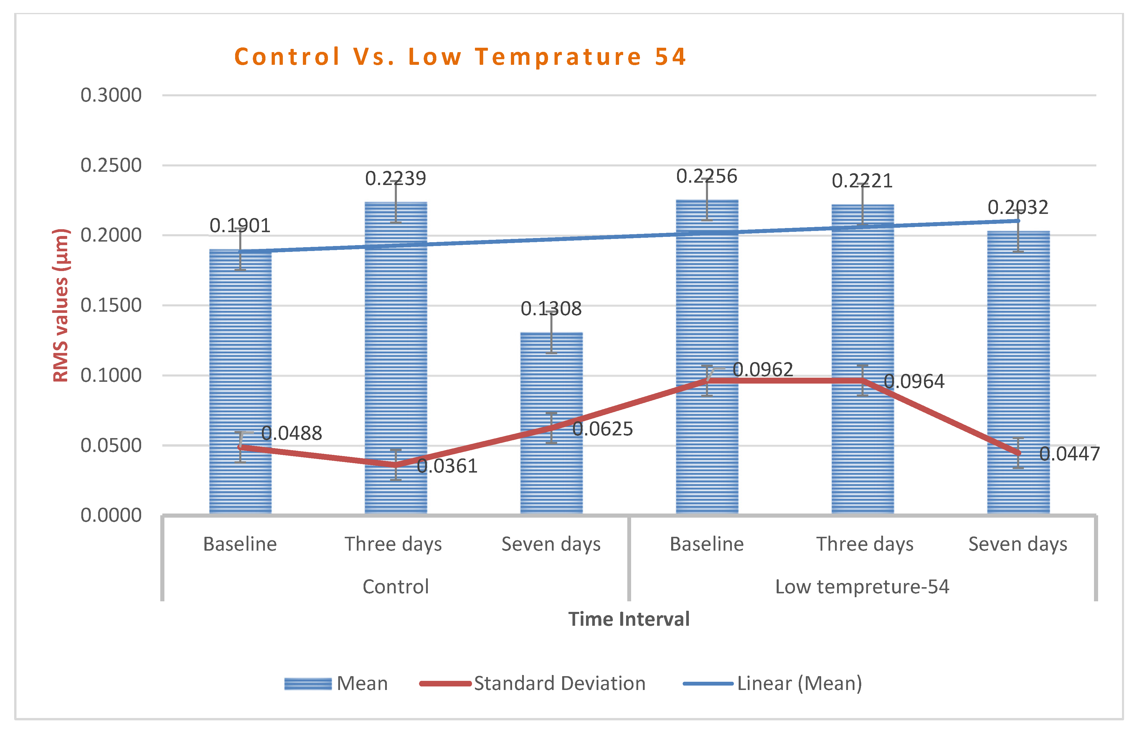 Regarding the comparison of disinfectant types, Tukey’s post hoc analysis revealed that RMS changes in the control group were not statistically significant compared to those in all other groups. However, the autoclave 121 °C and low-temperature 54 °C (