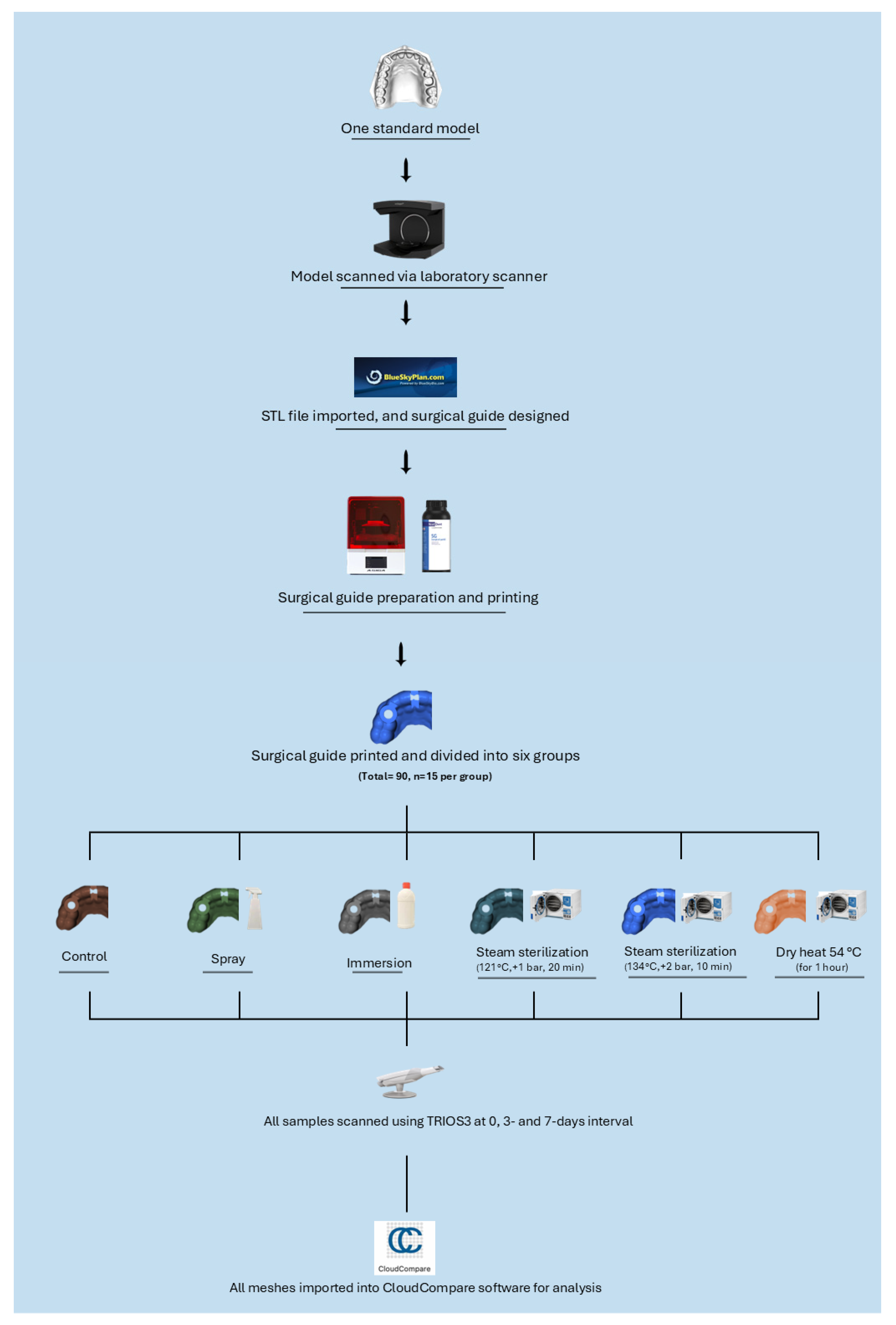 In fact, surgical guides are mostly used in flapless procedures; however, unexpected complications may sometimes necessitate flap reflection for better visualization and management. Despite the widespread usage of surgical guides, there is no universally accepted best practice for 3D-printed surgical guide sterilization [