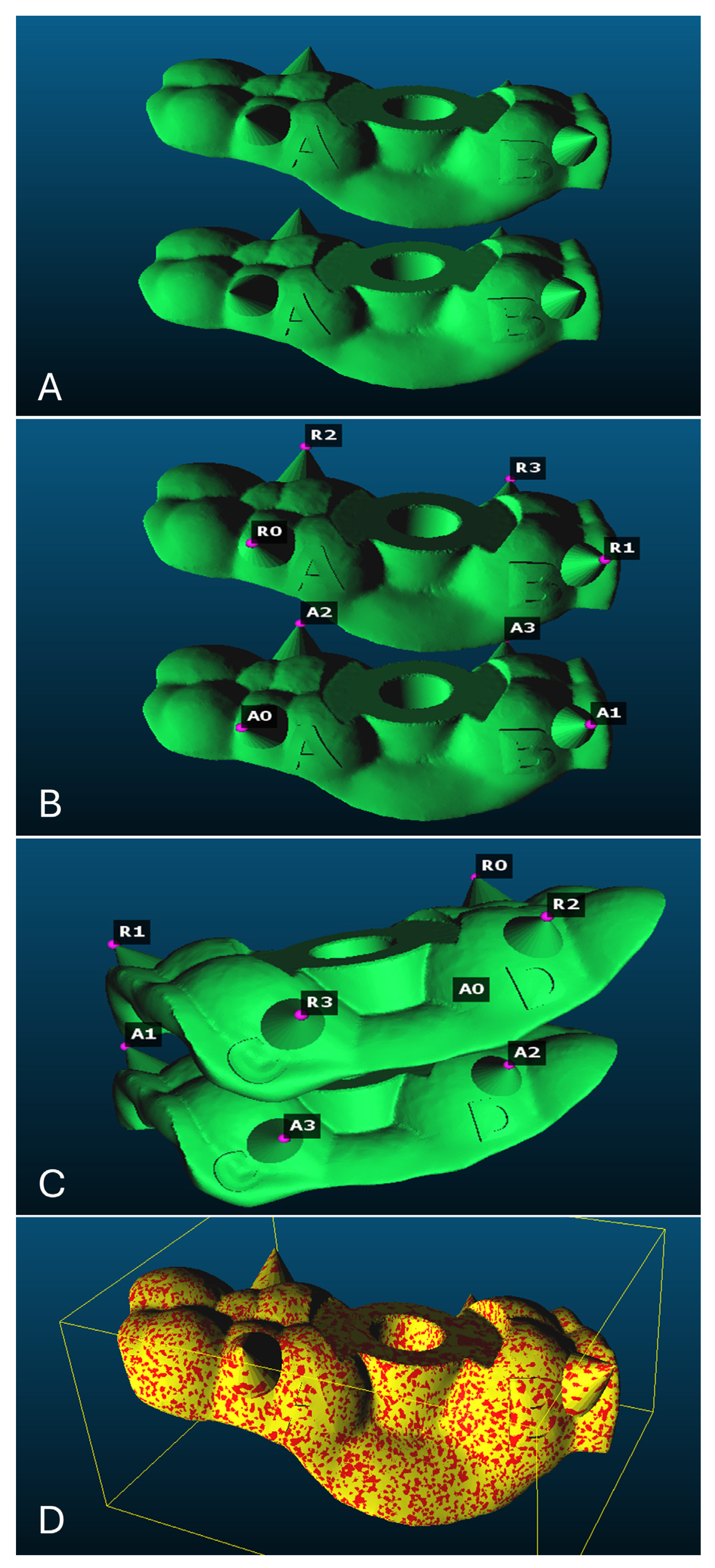 Each group was scanned using a TRIOS 3 intraoral scanner (TRIOS 3; 3Shape A/S). All samples had 4 fixed, pyramid-shaped, clearly visible reference points alongside 4 letters to the standardize reference points determination sequence; scanning was performed following the manufacturer’s scanning strategies at intervals of 0, 3, and 7 days (±3 h, stored in a dry-sealed pouch). Subsequently, the mesh files were imported into CloudCompare software (V2.14 alpha) to assess dimensional stability and evaluate any volumetric changes induced by each protocol on both the fitting and polished surfaces (
