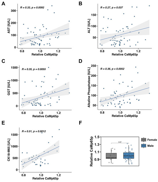 Correlation between serum CaMp65p and liver disease parameters in patients with alcohol use disorder. Pearson correlation analysis of serum CaMp65p levels with serum aspartate aminotransferase (AST) (A), alanine aminotransferase (ALT) (B), gamma-glutamyl transferase (GGT) (C), alkaline phosphatase (D), and of the M65 fragment of cytokeratin 18 (CK18-M65) (E). (F) Relative serum CaMp65p levels in male vs. female patients with alcohol use disorder.