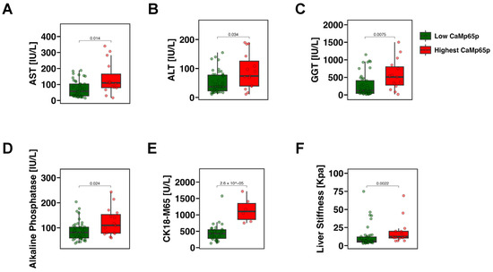 Markers of liver damage and fibrosis stratified by CaMp65p levels in patients with alcohol use disorder. Comparison between patients in the upper quartile vs. the lower three quartiles of CaMp65p serum levels. Serum aspartate aminotransferase (AST) (A), alanine aminotransferase (ALT) (B), gamma-glutamyl transferase (GGT) (C), alkaline phosphatase (D), the M65 fragment of cytokeratin 18 (CK18-M65) (E), and liver stiffness (F) in patients with alcohol use disorder stratified by CaMp65p quartile. Statistical comparison was performed using the Mann–Whitney U test.