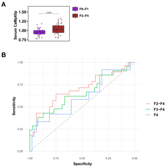 Serum CaMp65p levels by fibrosis stage and associated receiver operating characteristic curve analysis in patients with alcohol use disorder. (A) Serum CaMp65p levels in patients with higher fibrosis stages F2–F4 vs. F0–F1. Statistical comparison was performed using the Mann–Whitney U test. (B) Receiver operating characteristic curve (ROC) performance of serum CaMp65p levels in detecting fibrosis stage F2–F4, F3–F4, and F4.