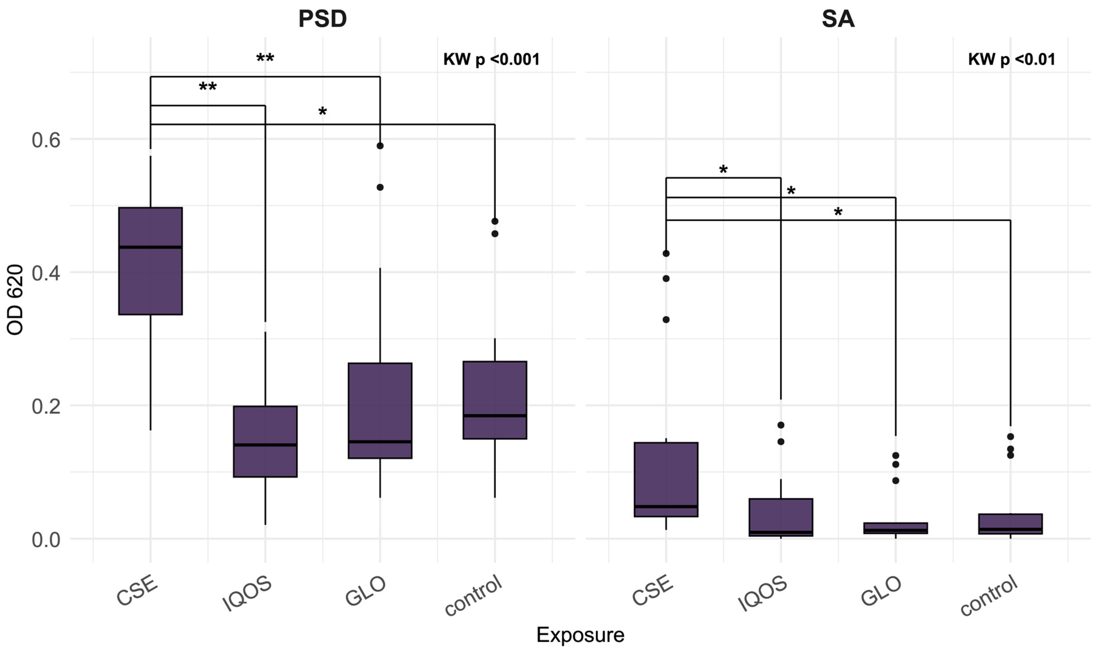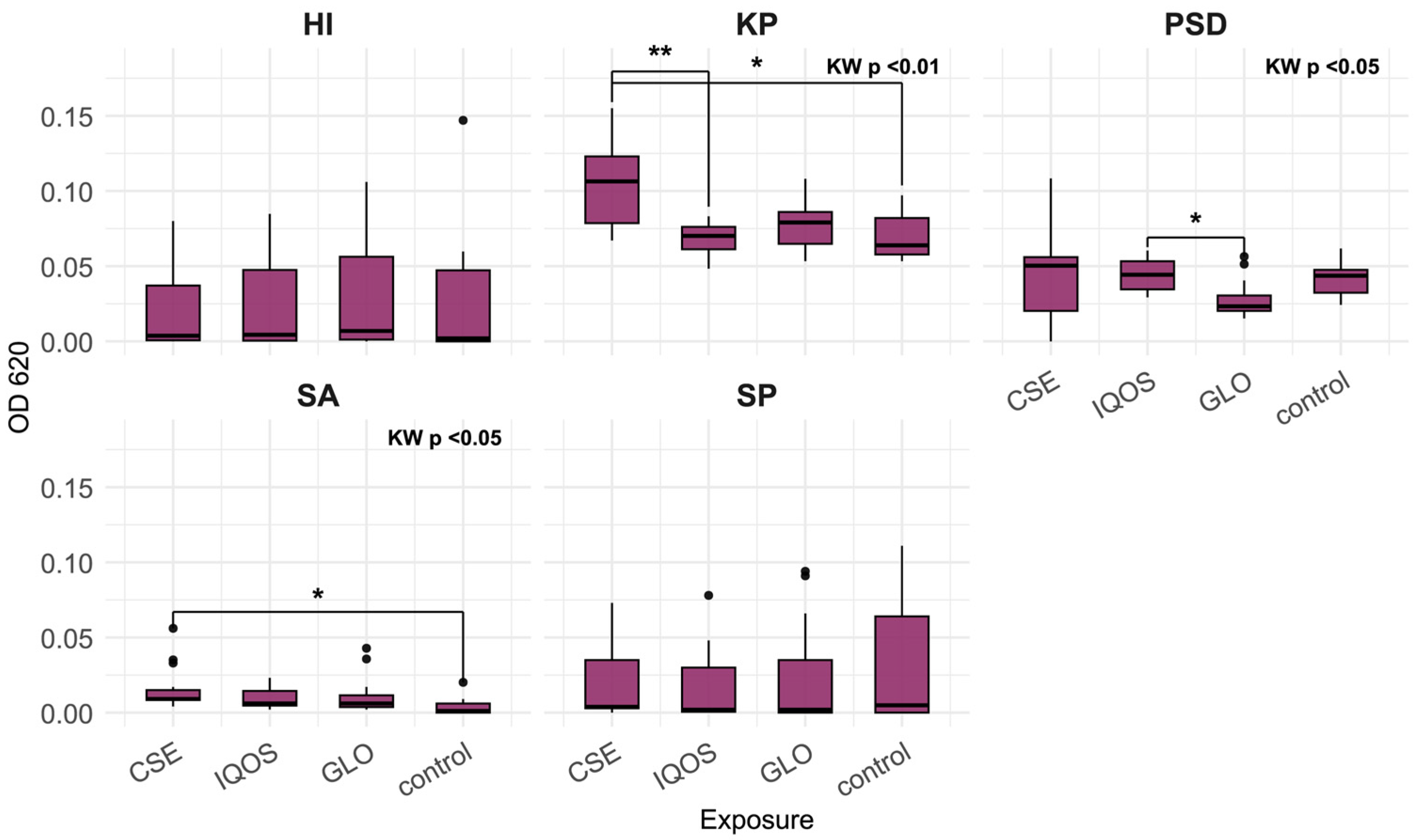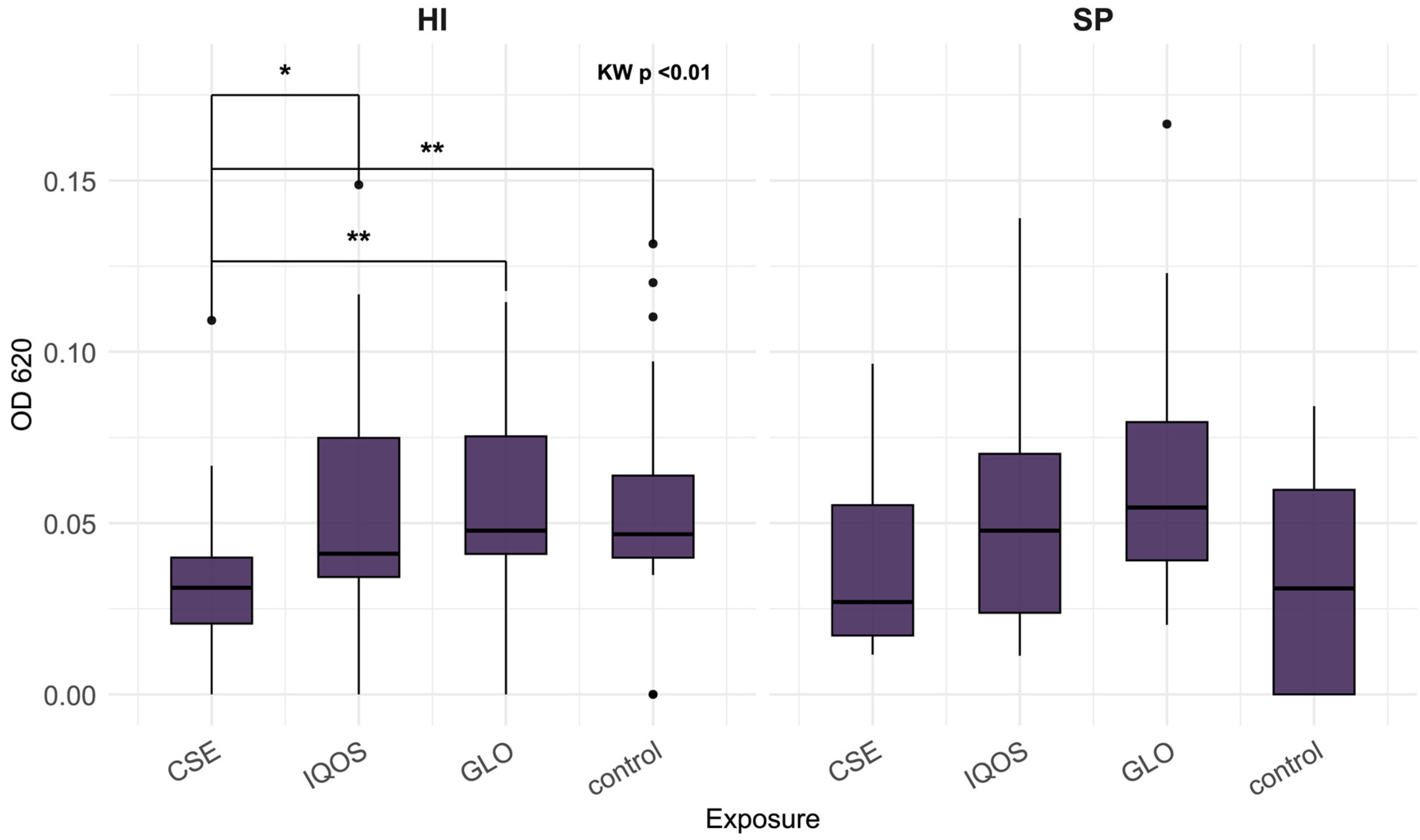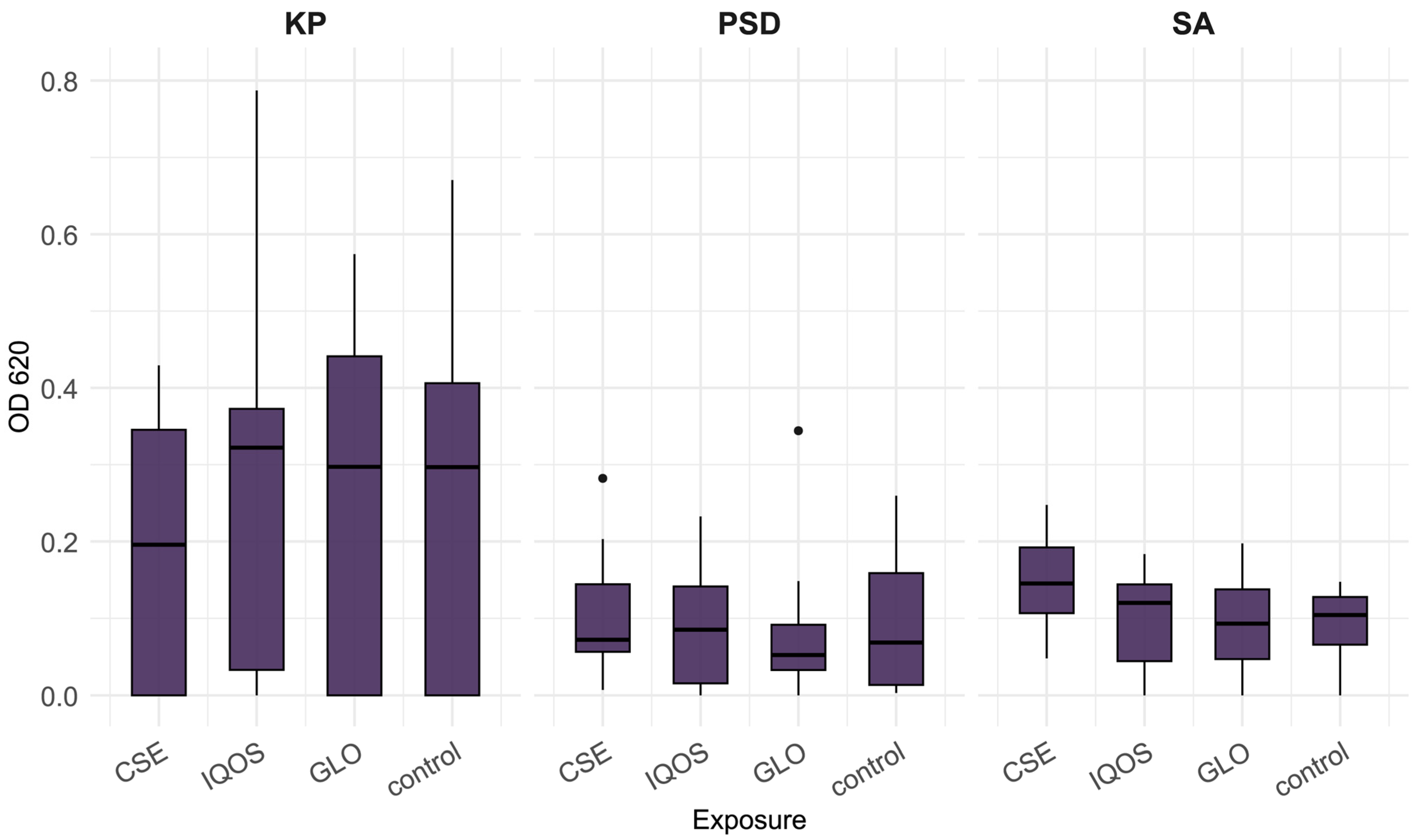 - McEachern, E.K.; Hwang, J.H.; Sladewski, K.M.; Nicatia, S.; Dewitz, C.; Mathew, D.P.; Nizet, V.; Crotty Alexander, L.E. Analysis of the Effects of Cigarette Smoke on Staphylococcal Virulence Phenotypes. Infect. Immun. 2015, 83, 2443–2452. [Google Scholar] [CrossRef]