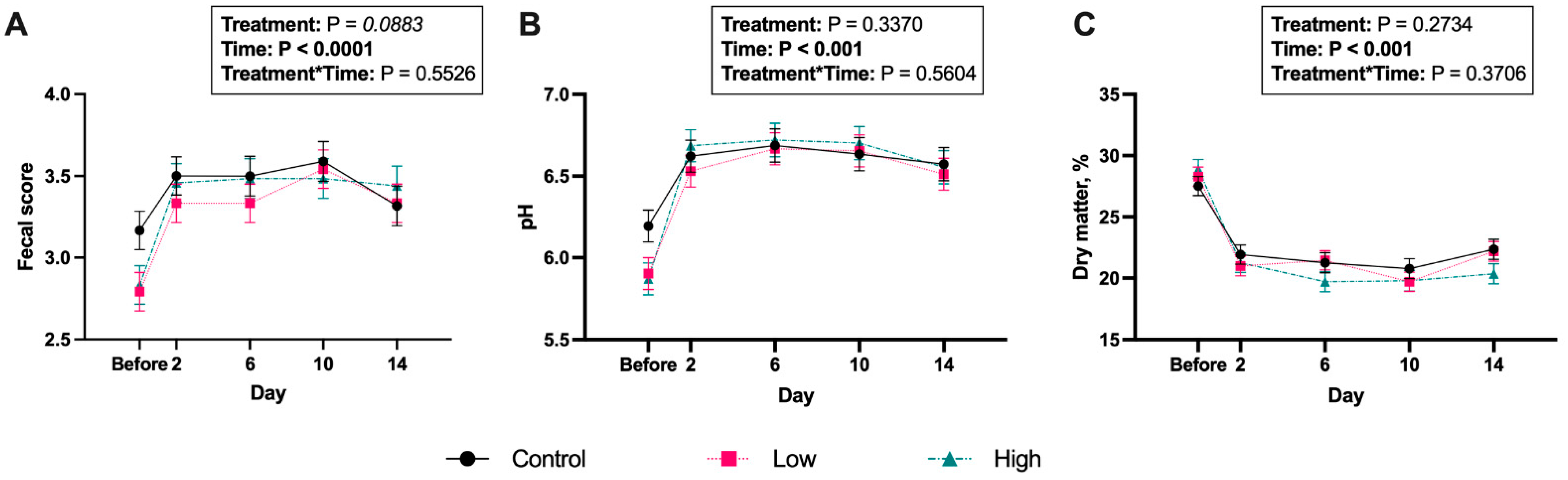 - Wilson, S.M.; Kang, Y.; Wren, J.F.; Menton, J.F.; Vinay, E.; Millette, M.; Kelly, M.R.; Xie, Z.; Miller, M.J.; Swanson, K.S. Effects of Bacillus coagulans (GBI-30, 6086) supplementation on apparent total tract nutrient digestibility and the fecal characteristics and metabolites, immunity, and microbiota of healthy adult dogs. J. Anim. Sci. 2025, in press. [Google Scholar]