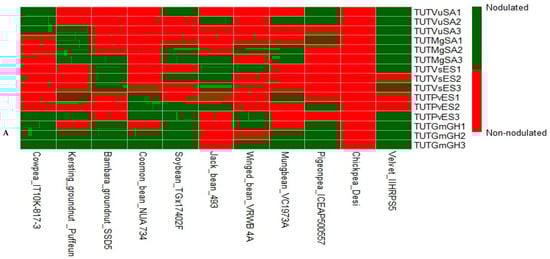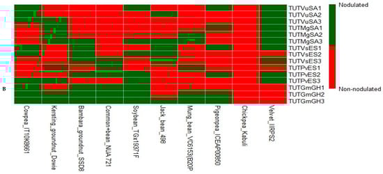 In 2022, cowpea (cv. IT10K-866-1) was effectively nodulated by isolates TUTGmGH1, TUTGmGH2, TUTGmGH3 and TUTPvES3 from common bean and TUTVsES1 and TUTVsES2 from Bambara groundnut, as well as by its own symbionts TUTVuSA1, TUTVuSA2 and TUTVuSA3 (Figure 1B). Bambara groundnut was also effectively nodulated by its own isolates TUTVsES1, TUTVsES2 and TUTVsES3, as well as by the three soybean isolates (TUTGmGH1, TUTGmGH2 and TUTGmGH3), TUTMgSA3 from Kersting’s groundnut and TUTPvES2 from common bean and the commercial inoculant strain. Isolates TUTVuSA3 (cowpea), TUTPvES1 and TUTPvES3 (common bean), as well as TUTGmGH2 and TUTGmGH3 (soybean), effectively induced nodulation in Kersting’s groundnut (landrace Dowie) in addition to its own symbionts (TUTMgSA1, TUTMgSA2 and TUTMgSA3) and the inoculant strain. Common bean (cv. NUA 721) was effectively nodulated by isolates TUTGmGH1, TUTGmGH2 and TUTGmGH3 from soybean as well as by its own isolates TUTPvES1, TUTPvES2 and TUTPvES3 and the commercial strain. Soybean (cv. TGX1937-1F) was effectively nodulated by its own isolates (TUTGmGH1, TUTGmGH2 and TUTGmGH3), as well as by isolates TUTVuSA1, TUTMgSA3, TUTVsES2 and TUTPvES3 from different legumes and the inoculant strain. Although velvet bean (cv.IIHR PS 2) was nodulated by isolates TUTVuSA1, TUTVuSA2, TUTVuSA3, TUTMgSA1, TUTMgSA2, TUTMgSA3, TUTVsES3, TUTPvES2, TUTPvES3, TUTGmGH1, TUTGmGH2 and TUTGmGH3, only six microsymbionts were effective, which included TUTVuSA1, TUTVuSA2, TUTPvES2, TUTPvES3, TUTVsES3 and TUTGmGH3. Although jack bean (Accession 498) formed root nodules with isolates TUTVuSA2, TUTMgSA3, TUTVsES1, TUTVsES2, TUTVsES3, TUTGmGH3 and TUTPvES2, only two strains (TUTVuSA2 and TUTVsES2) were effective. Pigeonpea (cv. ICEAP00850) was effectively nodulated by isolates TUTVuSA1, TUTMgSA1, TUTVsES1, TUTPvES2, TUTGmGH2 and TUTGmGH3. Similarly, mungbean (cv. VC6153 (B-20P) was effectively nodulated by isolates TUTMgSA2, TUTMgSA3, TUTPvES1, TUTGmGH2 and TUTGmGH3 while chickpea (cv. Kabuli) failed to form root nodules with all test isolates (Figure 1B).