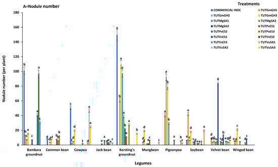 Nodule number and nodule dry matter of legume species used in cross-infectivity test in the glasshouse in 2022: (A) = nodule number and (B) = nodule DM. Bars with dissimilar letters are significantly different at p < 0.05. Missing bars are denoted as zero nodulation.