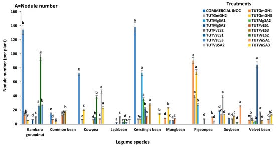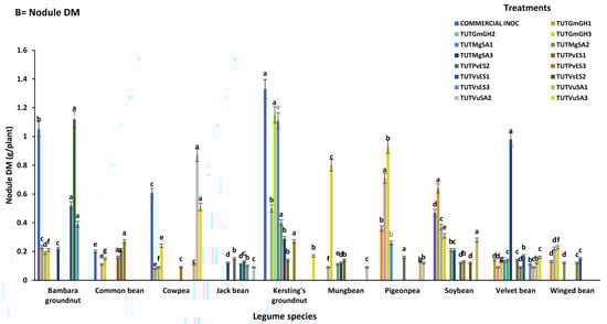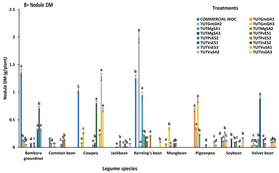 Nodule number and nodule dry matter of legume species used in cross-infectivity test in the glasshouse in 2021: (A) = nodule number and (B) = nodule DM. Bars with dissimilar letters are significantly different at p < 0.05. Missing bars are denoted as zero nodulation.