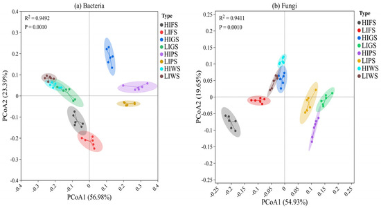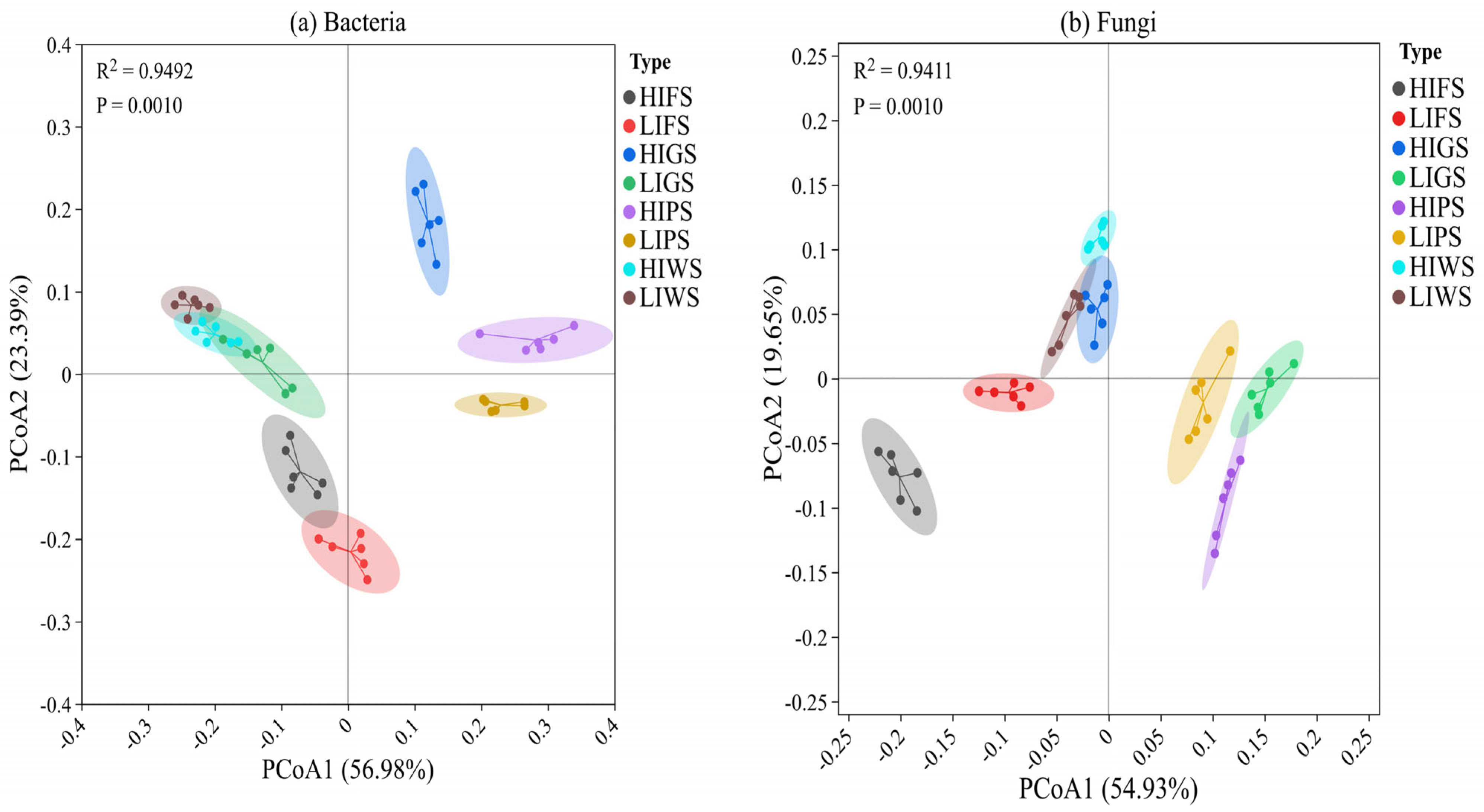 - Zhou, Y.; Wang, J. The Composition and Assembly of Soil Microbial Communities Differ across Vegetation Cover Types of Urban Green Spaces. Sustainability 2023, 15, 13105. [Google Scholar] [CrossRef]