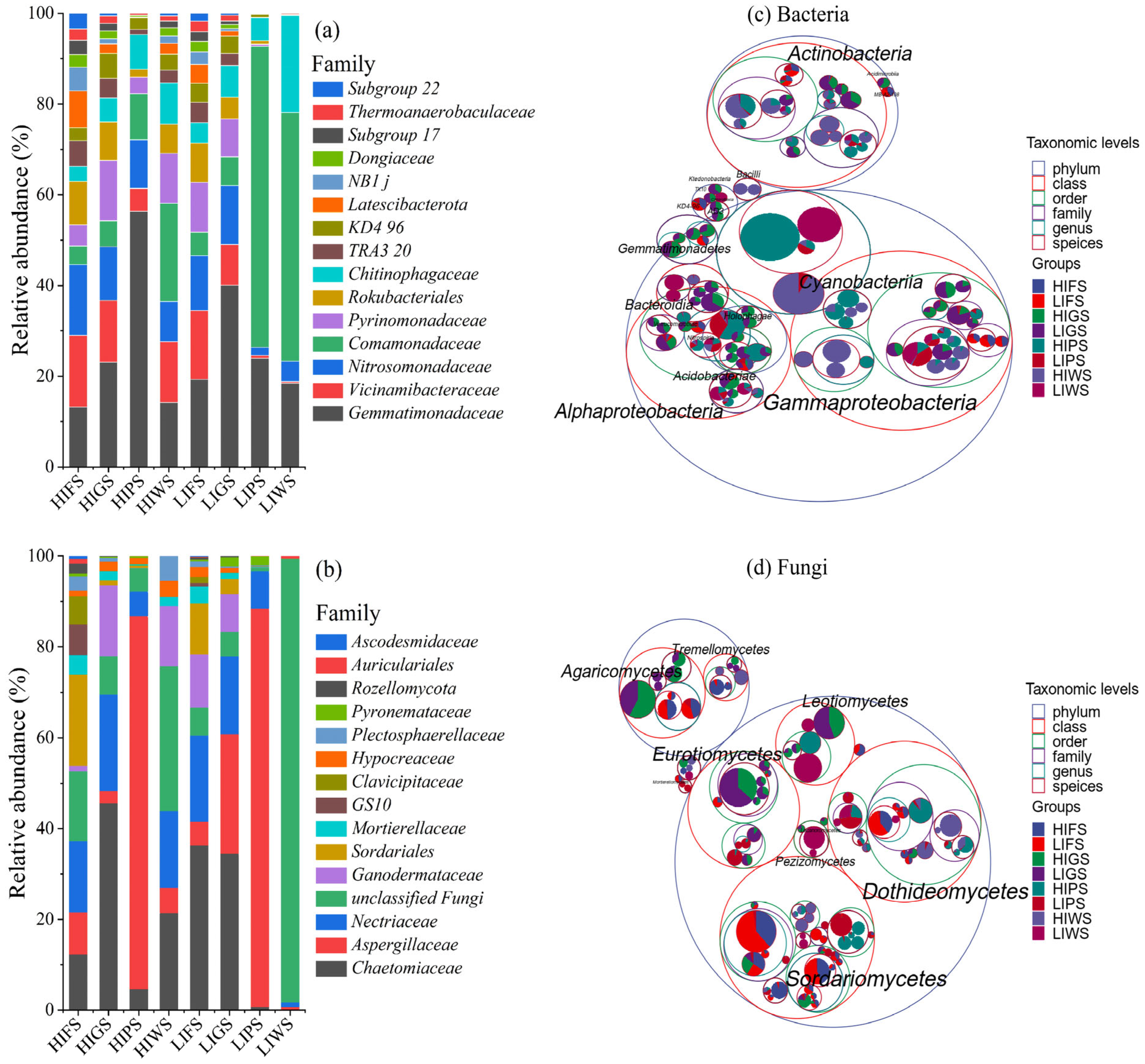 3.2. The Composition and Structure of Microbial Communities in Various Urban Green Spaces
