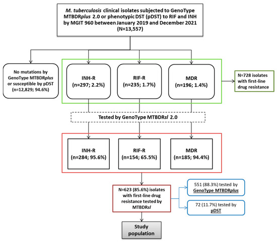 At the initial stage of MTBDRsl implementation in 2019, isolates presenting inferred or inconclusive results in molecular assays were referred for pDST using the MGIT 960 system; therefore, not all, but the majority of INH/RIF or MDR isolates were tested by MTBDRsl in our study.