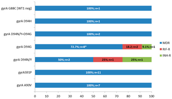 Frequency and number of M. tuberculosis isolates with gyrA mutations according to drug resistance type, MDR: multidrug-resistant, RIF-R: rifampicin-resistant, INH-R: isoniazid-resistant, G88C mutation was detected by gene sequencing and the MTBDRsl result is in brackets (WT1 probe negative, i.e., inferred mutation), * one isolate with D94G had also rrs a1401g, and two were heteroresistant.