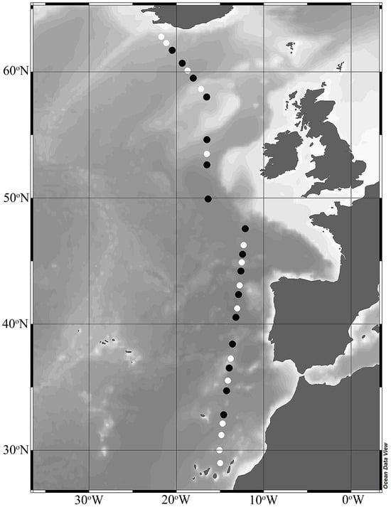 In the spring (April–May) of 2011, 32 stations (each separated by approximately 100 km) were sampled along a North–South transect in the Northeast Atlantic Ocean during the STRATIPHYT II cruise, which took place onboard the R/V Pelagia (Figure 1). Water samples were collected prior to dawn at each station from at least 10 separate depths using 24 plastic samplers (General Oceanics type Go-Flow, 10 L) mounted on a trace-metal clean system framed with a fully titanium sampler equipped with a CTD (Seabird 9+; standard conductivity, temperature, and pressure sensors) system and auxiliary sensor for chlorophyll autofluorescence (Chelsea Aquatracka Mk III). Chlorophyll autofluorescence sensor data were calibrated against HPLC data according to van de Poll et al. [26]. All water samples were collected inside a trace-metal clean container and handled according to Eich et al. [27]. Phytoplankton carbon biomass (PhytoC) was determined by applying size-specific carbon conversion factors to phytoplankton cell abundances (PhytoA) obtained using flow cytometry [28,29,30].