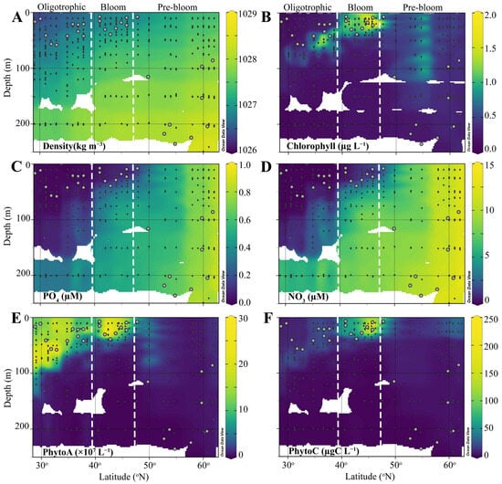 During the spring (April–May) of 2011, the upper water column of the study area ranged from weakly to non-stratified (based on , Table S1) [30], with the latitudinal region between 29 and 48 °N characterized as weakly stratified with MLDs ranging from 11 to 59 (Figure 2). Higher latitudes stations (48–63 °N) were classified as well-mixed and were marked by deep MLDs ranging from 7 to 307 m (Table S1). Accordingly, seawater density and nutrient profiles demonstrated clear depth and latitudinal gradients (Figure 2A,D). Physicochemical characteristics and phytoplankton community dynamics have previously been discussed in detail [26,30] (Figure 2). Briefly, the ML of the southern region (29–40 °N) was characterized as oligotrophic based on nutrient concentrations (i.e., NO3 ≤ 0.13 µM and PO4 ≤ 0.03 µM). However, average Chl a concentrations (0.25 µg L−1), exceeded the <0.07 µg L−1 threshold previously used to define oligotrophic waters. Nutrient concentrations in the ML of the mid-latitude region (40–46 °N) remained low, averaging 0.07 ± 0.01 µM and 0.93 ± 0.21 µM for PO4 and NO3, with ML Chl a concentrations (averaging 1.16 ± 0.13 µg L−1) 4-fold higher compared to the southernmost region. In the northern well-mixed stations (48–63 °N), there was very little variability in nutrients and Chl a concentrations with depth, averaging 0.67 ± 0.02, 10.22 ± 0.32 µM, and 0.48 ± 0.03 µg L−1 for PO4, NO3, and Chl a, respectively.