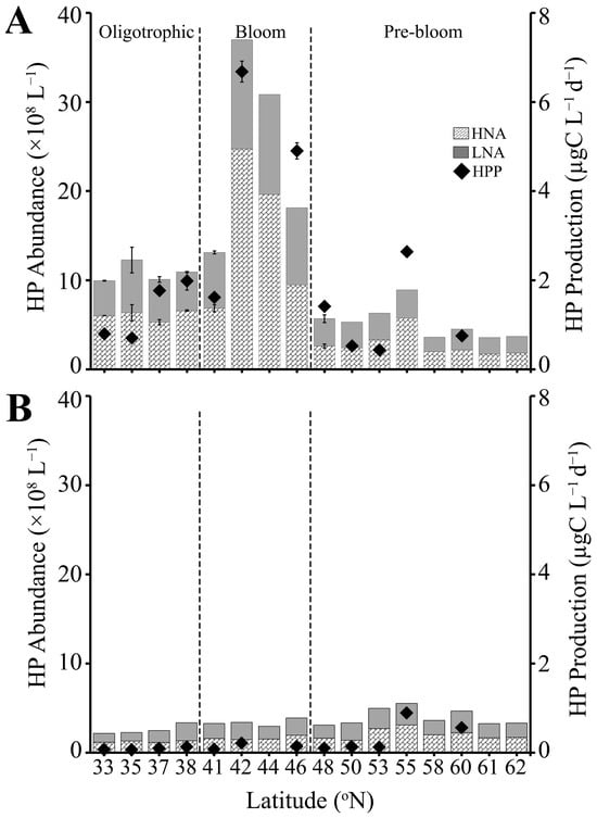 Heterotrophic prokaryote abundance (HPA) displayed distinct latitudinal trends consistent with the above-described characteristics of the different regions (Table S2, Figure 3). SURFACE samples (0–90 m) from the Oligotrophic region had moderate HPA levels, averaging 9.8 ± 0.3 × 108 L−1 (ranging from 5.0 to 14.6 × 108 L−1),which increased nearly 1.6 fold in the Bloom region (average 15.4 ± 1.6 × 108 L−1 ) and then decreased to the lowest values (average 5.2 ± 0.3 × 108 L−1) in the deeply mixed Pre-bloom region. HP abundance and production were tightly coupled in SURFACE samples (Pearson’s correlation: N = 24, r = 0.90, p-value = 1.4 × 10−9). Accordingly, HPP was low in both the Oligotrophic and Pre-bloom regions, averaging 1.1 ± 0.2 and 1.0 ± 0.4 µgC L−1 d−1, respectively (Figure 3A), and increased 4-fold to an average of 3.9 ± 1.1 µgC L−1 d−1 in the Bloom region. Highest HPA (37 × 108 cells L−1) and HPP (7.1 ± 0.06 µgC L−1 d−1) values were recorded in the Bloom region at station 13 (42 °N; Figure 3A). The average relative proportion of HNA and LNA cells (HNA:LNA) within SURFACE samples was 1.2 ± 0.04, 1.2 ± 0.05, and 1.1 ± 0.05 for the Oligotrophic, Bloom, and Pre-bloom regions, respectively.