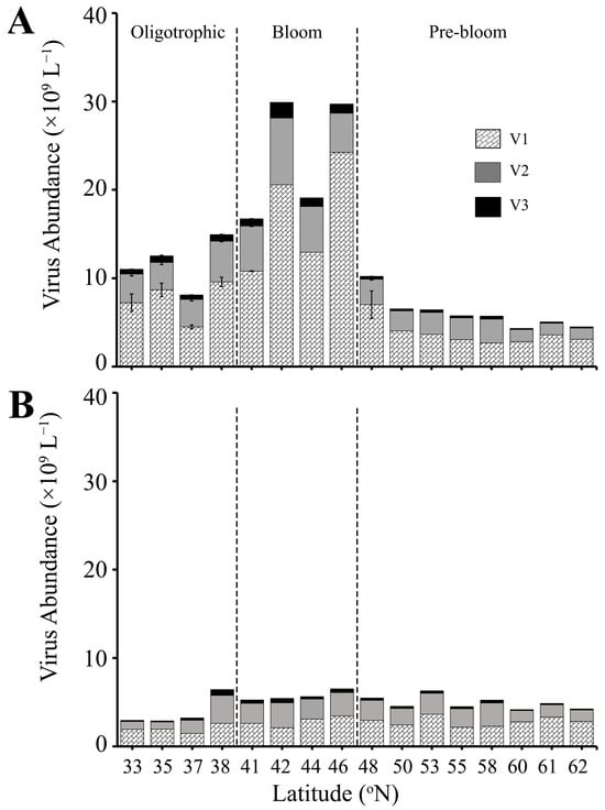 Abundance of virus subpopulations V1, V2, and V3 (×109 L−1) at locations where viral production experiments were conducted. (A) SURFACE (0–90 m) and (B) DEEP (90–200 m) samples. The dashed line separates three regions (Oligotrophic, Bloom, Pre-bloom). Error bar represents standard error.