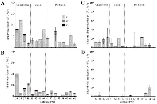 Total lytic virus production rate (VP) was highest in the Oligotrophic region, ranging from 2.9 to 41.1 × 109 viruses L−1 d−1 (average 14.3 ± 5.6 × 109 L−1 d−1) (Figure 5A, Table S3). VP in Bloom and Pre-bloom regions were comparable, with an average of 8.5 ± 1.9 × 109 and 6.8 ± 1.6 × 109 viruses L−1 d−1, respectively. Unlike VA, no correlation was observed for VP and HPA. Despite average V1 abundance being comparable across the 3 regions, the V1 subgroup had the lowest contribution to total VP in the Oligotrophic region (i.e., average 75.3 ± 8.9%, compared to 92.8 ± 4.1% and 92.4 ± 2.5% in the Bloom and Pre-bloom region, respectively; Figure S5A). Contributions of V2 to total VP were variable, ranging from 1.6% to 47.1% in the Oligotrophic region (average 20.7 ± 7.3%) and decreased to 6.7 ± 4.0% and 6.6 ± 2.2% in the Bloom and Pre-bloom regions, respectively (Table S3, Figure S5A). Contributions of V3 were on average between 0.6% and 4.0% across all three regions, with the highest contribution of 11.6% at 33 °N. Lytic production of V2 and V3 were negative at 60 °N (Table S3, not in figure).