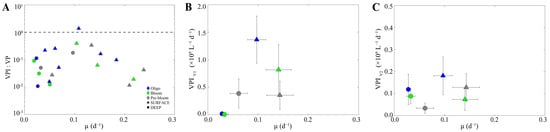 The relationship between the induced viral production (VPI) and heterotrophic prokaryote-specific growth rate (µ). (A) Variation in the relative proportion of lysogenic (VPI) to lytic viral production (VP) as a function of heterotrophic prokaryote-specific growth rate, shown on a logarithmic scale; the dashed line denotes VPI:VP = 1. (B) Induction rate of integrated V1 virus (VPIV1) and (C) V2 virus (VPIV2) subpopulations as a function of heterotrophic prokaryote-specific growth rate.