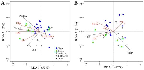 Redundancy analysis (RDA) correlation triplots of factors important in structuring the abundance and production of (A) heterotrophic prokaryotes and (B) viral subpopulations. Response variables are shown in red and explanatory variables that significantly (α = 0.1) contributed to the model in black. Symbols represent individual sampling points ((A): n = 40 and (B): n = 26), and color and shape are coded according to the specific region and depth level, respectively. The total variance explained by the RDA models were (A) 62% and (B) 58%, respectively.