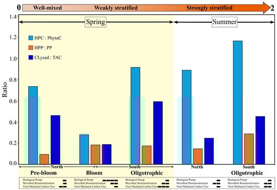 Taken as a whole, the STRATIPHYT study highlights the dominant role of microbially mediated and virus-driven recycling of carbon, demonstrating how progressive changes in stratification and associated ecosystem structure regulate the balance between carbon recycling and export potential, with the greatest export capacity occurring under weakly stratified conditions (Figure 8, Table S4). Prior to the onset of stratification and bloom development, the biomass (HPC:PhytoC) ratio was estimated at 0.74, consistent with ratios (~0.7–1.0) commonly reported for open-ocean oligotrophic ecosystems [1,107]. This value indicates a moderately, microbially dominated system with limited capacity for grazing and carbon export through the biological carbon pump. It likely reflects the combined effects of residual deep mixing and light limitation constraining phytoplankton growth, coupled with elevated viral turnover of heterotrophic prokaryote carbon (as indicated by Clysed:TAC = 0.46). In agreement, the low production (HPP:PP) ratio (0.09) observed in this region reflects reduced autotrophic production under light-limited conditions, likely resulting in carbon limitation of heterotrophic prokaryotic production. At the onset of weak stratification, the biomass ratio drops to 0.28, indicating a dominance of new production and a large fraction of carbon in phytoplankton biomass (i.e., bloom development), leading to a higher potential for grazing and carbon export via the biological pump. As the nutrient limitation in the surface mixed layer of the oligotrophic regions constrains primary production, the ecosystem again moves towards a predominance of the microbial loop and viral-mediated recycling, as indicated by an average biomass ratio ~1.04 and fraction of total available carbon lysed (Clysed:TAC) ~0.52. Interestingly, the highest biomass (1.20) and production (0.29) ratios were observed in the southern oligotrophic region during the summer, likely sustained by elevated phytoplankton lysis reported in this region during the study. The enhanced release of dissolved organic carbon from virus-induced cell lysis would have fueled microbial remineralization, underscoring the strong viral regulation of phytoplankton biomass [71] and microbial carbon recycling. By integrating microbial stock and rate measurements of both production and loss, the STRATIPHYT study provides a clearer understanding of how microbial and viral interactions regulate the balance between carbon recycling and export across seasonal transitions.