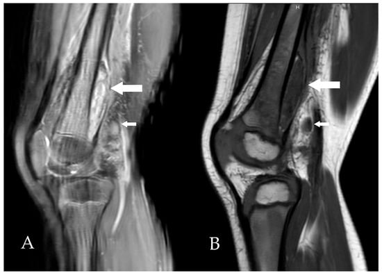 Sagittal MRI slices of the right knee, T2-weighted (A) and T1-weighted (B), showing a heterogeneous subperiosteal fluid collection (large arrows) and the presence of lymphadenopathy (small arrows).