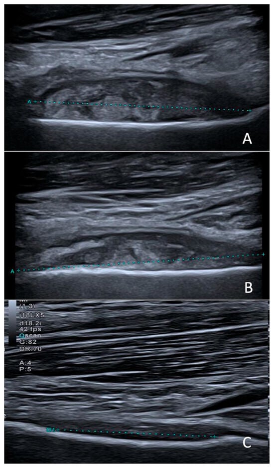 Sagittal ultrasound scans obtained at diagnosis (A), two weeks later (B), and three months after treatment initiation (C), showing progressive regression of the subperiosteal collection (between calipers).