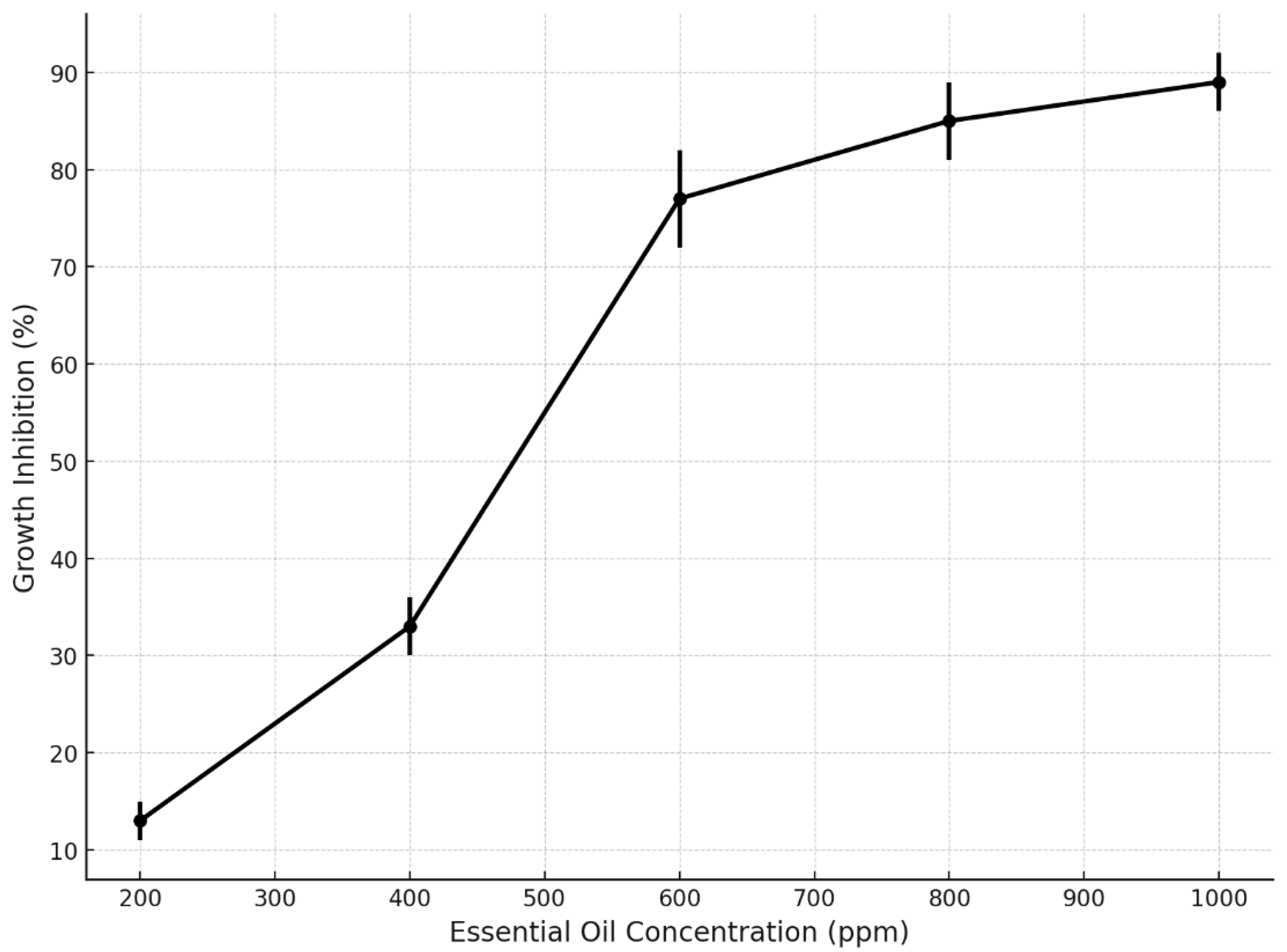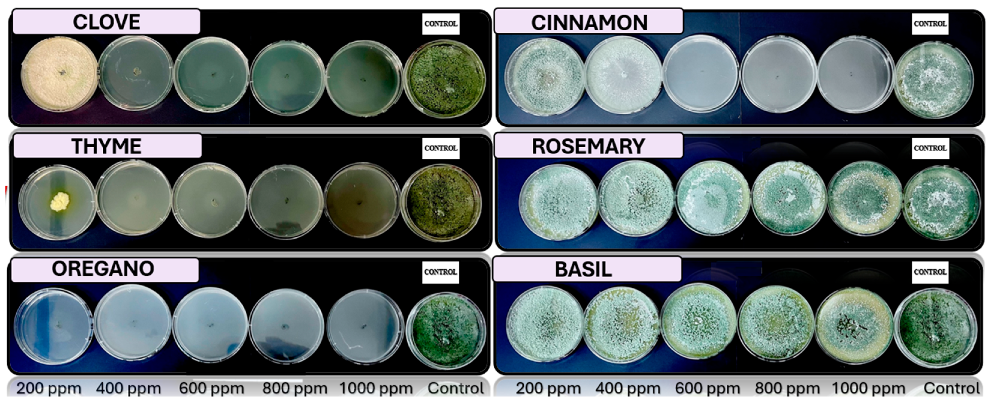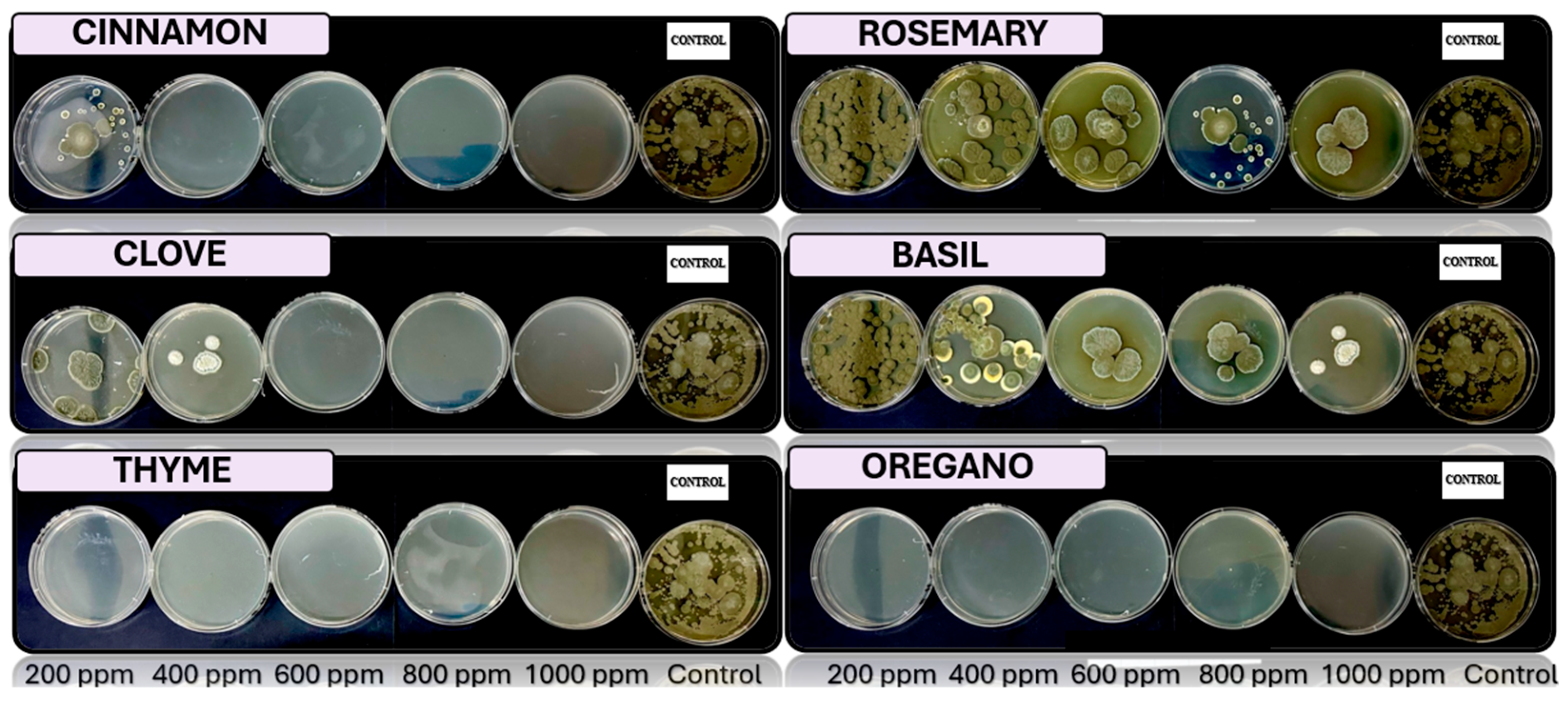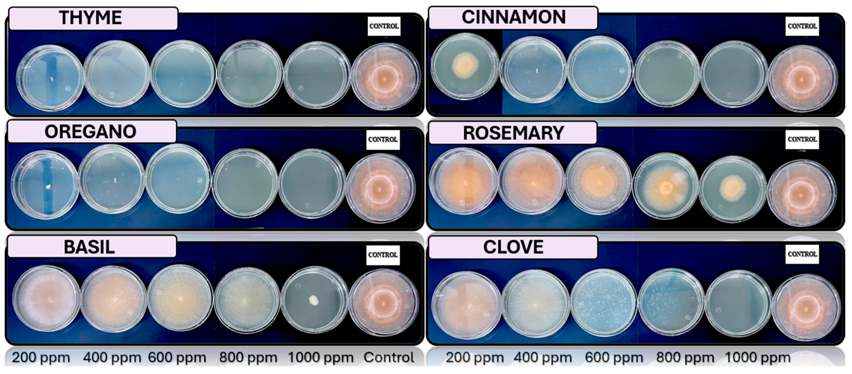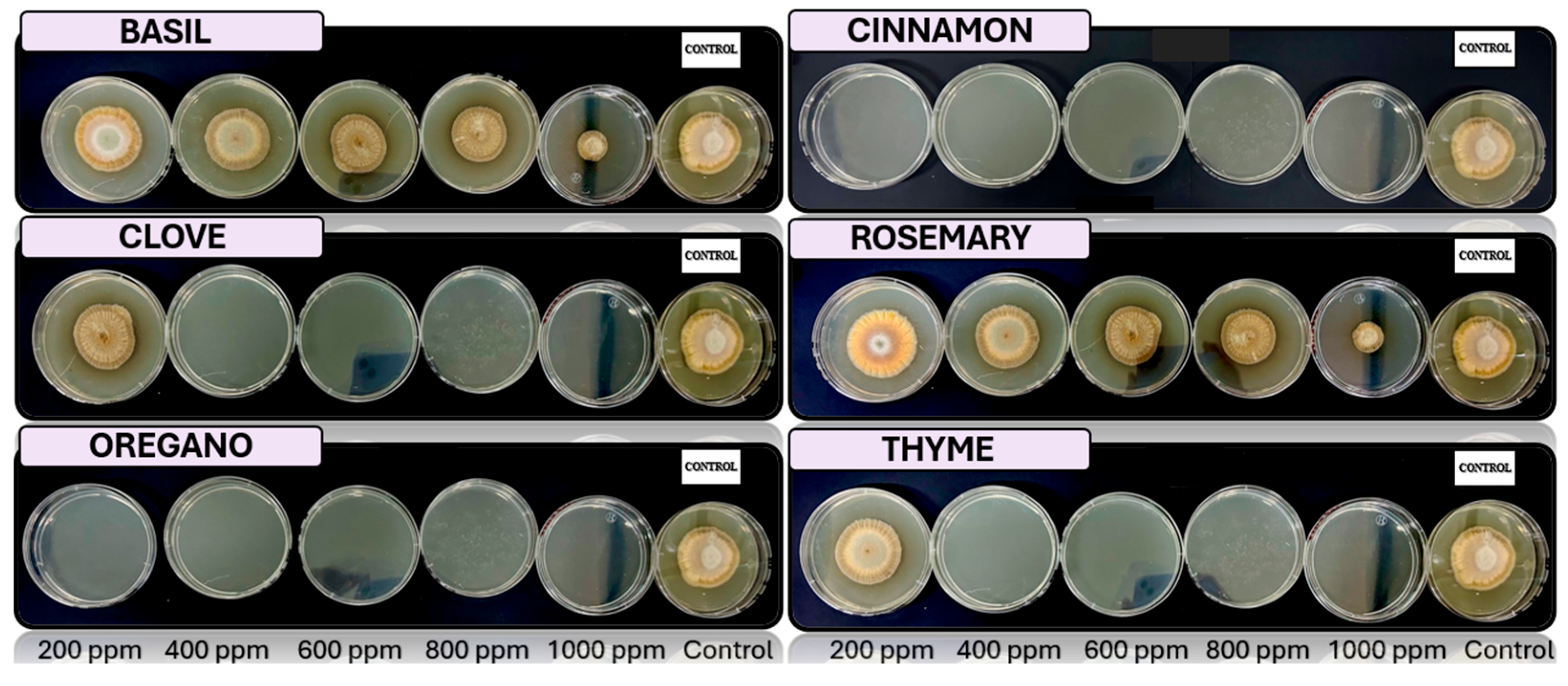 2.5. In Vitro Antifungal Activity with Essential Oils