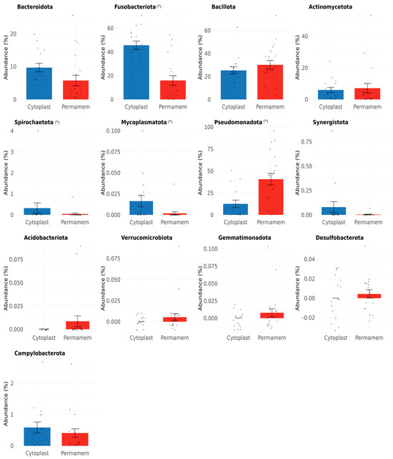 Bacterial species detected at the phylum level in the Cytoplast™ and Permamem® group. * indicates p < 0.05.