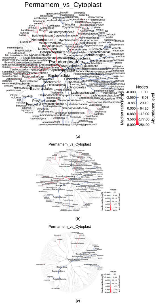 To further explore the differences between the two groups at lower taxonomic levels, a heat tree analysis was performed using the MicrobiomeAnalyst 2.0 web tool [21] (Figure 2). Differences between groups were defined using the Wilcoxon test at three significance thresholds (p < 0.05, p < 0.01, p < 0.001) to strengthen the validity of the findings. In the resulting heat trees, nodes represent species, node size represents abundance, and node color indicates the significance of the difference between groups. Blue stands for enhanced species presence in Cytoplast™ and red stands for enhanced species presence in Permamem® group).