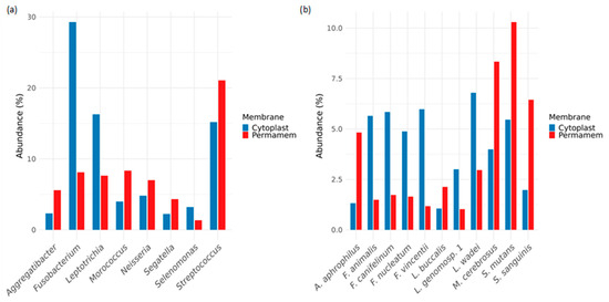 Consistent with Figure 3a, the Cytoplast™ group was dominated by the Fusobacterium species (F. Nucleatum, F. animalis, F. canifelinum, F. vincentii and F. nucleatum), which in Permamem® samples were detected only at <2.5% relative abundance (Figure 3b).