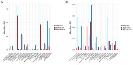 With respect to the less abundant but noteworthy bacterial genera, several taxa were relatively enriched in the Cytoplast™ group, including Campylobacter (0.65%), Dialister (0.22%), Treponema (0.31%), Parvimonas (0.63%) and Tannerella (0.42%). Among these genera, Campylobacter (0.5%) was the most abundant in the Permamem® group, followed by Parvimonas (0.38%) and Dialister (0.21%). Treponema and Tannerella, as well as the majority of genera depicted in Figure 4a, were detected at levels below 0.1% (Figure 4a).