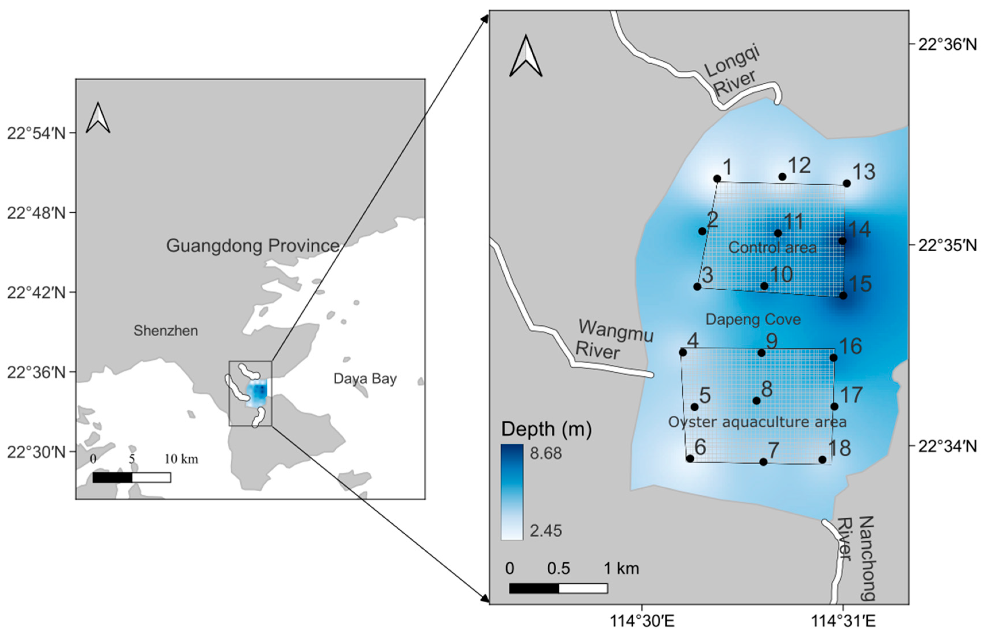 - Liu, Q.; Liao, Y.B.; Zhu, J.H.; Shi, X.; Shou, L.; Zeng, J.; Chen, Q.; Chen, J. Influence of Biodeposition by Suspended Cultured Oyster on the Distributions of Trace Elements in Multiple Media in a Semi-Enclosed Bay of China. J. Hazard. Mater. 2023, 443, 130347. [Google Scholar] [CrossRef]
