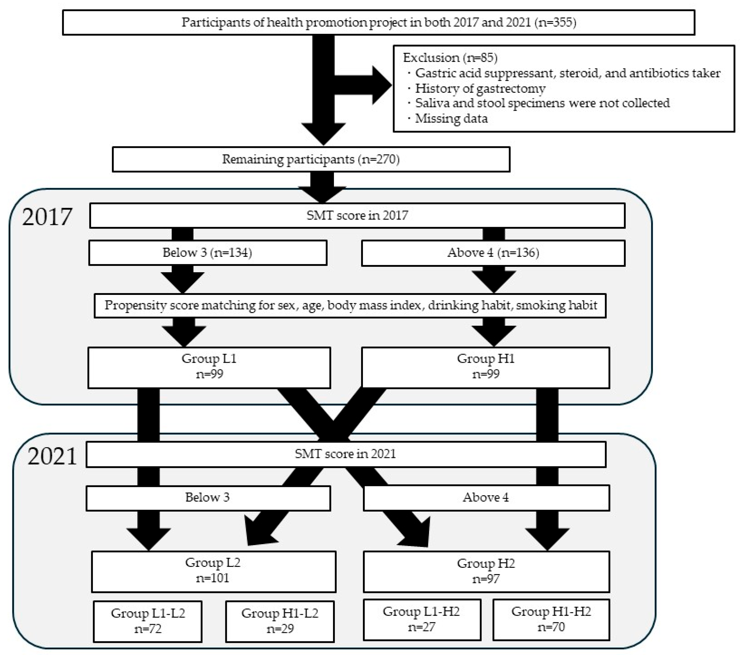 Sato, S.; Chinda, D.; Mikami, K.; Tobinai, M.; Ishidoya, N.; Furusawa, K.; Miyashiro, K.; Yoshida, K.; Iino, C.; Sawada, K.; et al. Four-Year Longitudinal Epidemiological Study on the Association Between a Multi-Item Saliva Testing System and Oral and Gut Microbiota. Microorganisms 2025, 13, 2483. https://doi.org/10.3390/microorganisms13112483