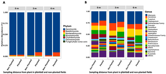 Distribution of the 20 most prevalent taxa, categorized by (A) phylum and (B) genus. Bars represent mean relative abundance by field type (non-planted vs. planted) within each distance class (0 m, 3 m, 6 m). Taxa not ranked among the top 20 are grouped under ‘Others’.