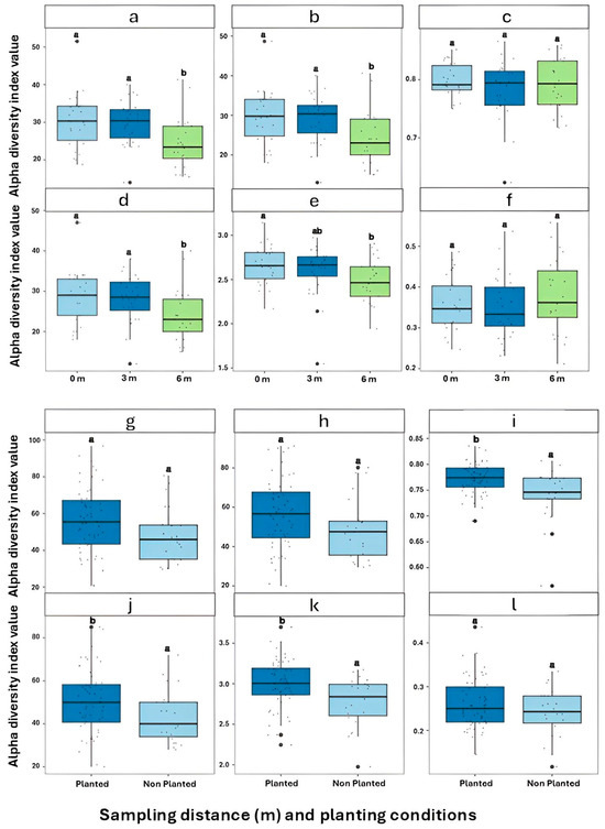 Alpha diversity indices of fungal communities across (a–f) sampling distance gradients (0 m, 3 m, 6 m) and (g–l) planting conditions (Planted vs. Non-planted) in Ziziphus lotus rhizosphere soils. (a,g) Observed richness; (b,h) Chao1; (c,i) Pielou’s evenness; (d,j) Shannon–Wiener index; (e,k) Inverse Simpson index; (f,l) Simpson’s evenness. Different letters (a, b) above boxplots indicate significant differences among groups.