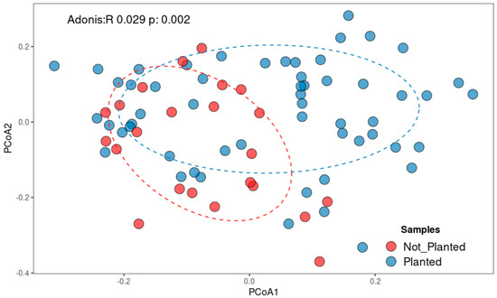 Beta diversity analysis confirmed a clear special distribution of fungal communities. PCoA based on Bray–Curtis dissimilarities (Figure 3) revealed loose clustering at 0 m, while 3 m and 6 m samples were more widely scattered. An ADONIS test confirmed significant effects of distance on community composition (p = 0.002). Although the effect size was modest, these results indicate that agricultural cultivation exerts a detectable influence on community composition. Planted fields tended to cluster separately from non-planted field, reflecting differences in the relative abundances of several taxa. Nonetheless, the substantial overlap between groups suggests the presence of a shared core fungal community across both land-use types.
