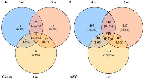 At the genus level (Figure 4A), 3 m samples harbored the most unique genera (37, 18.1%), followed by 0 m (34, 16.7%) and 6 m (8, 3.9%). 72 genera (35.3%) were shared across all distances. At the ASV level (Figure 4B), 3 m again showed the highest number of unique ASVs (637, 35.5%), compared to 467 (26.0%) at 0 m and 304 (16.9%) at 6 m. Only 149 ASVs (8.3%) were common for all distances.