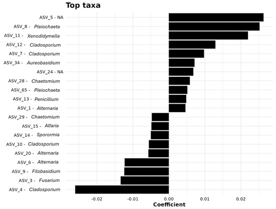Figure 5 visualizes these associations, showing taxa such as ASV_8 (Pleiochaeta) and ASV_5 (unassigned) as strongly responsive to distance. Genera including Xenodidymella, Alternaria, and Cladosporium contributed moderately, suggesting widespread but spatially variable presence.